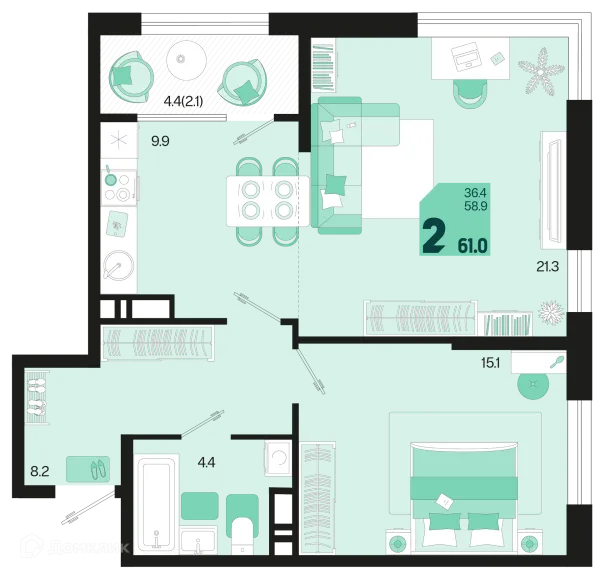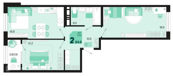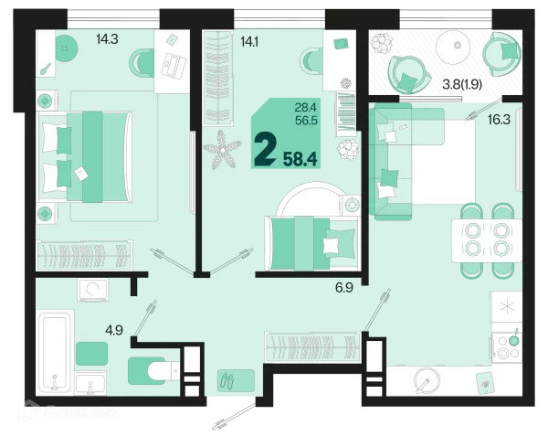 2 комн. квартира в Краснодаре в ипотеку от 57 543 руб/месяц