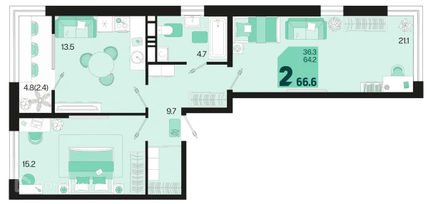 2 комн. квартира в Краснодаре в ипотеку от 69 928 руб/месяц