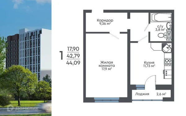 1 комн. квартира в Воронеже в ипотеку от 32 073 руб/месяц
