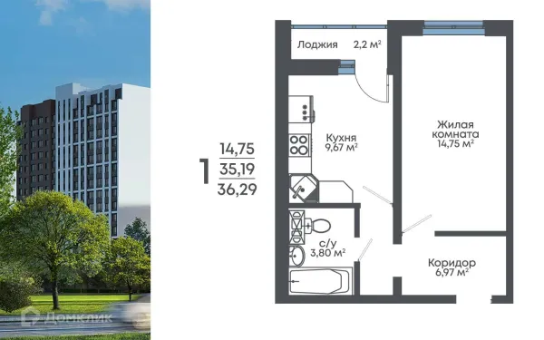 1 комн. квартира в Воронеже в ипотеку от 35 536 руб/месяц